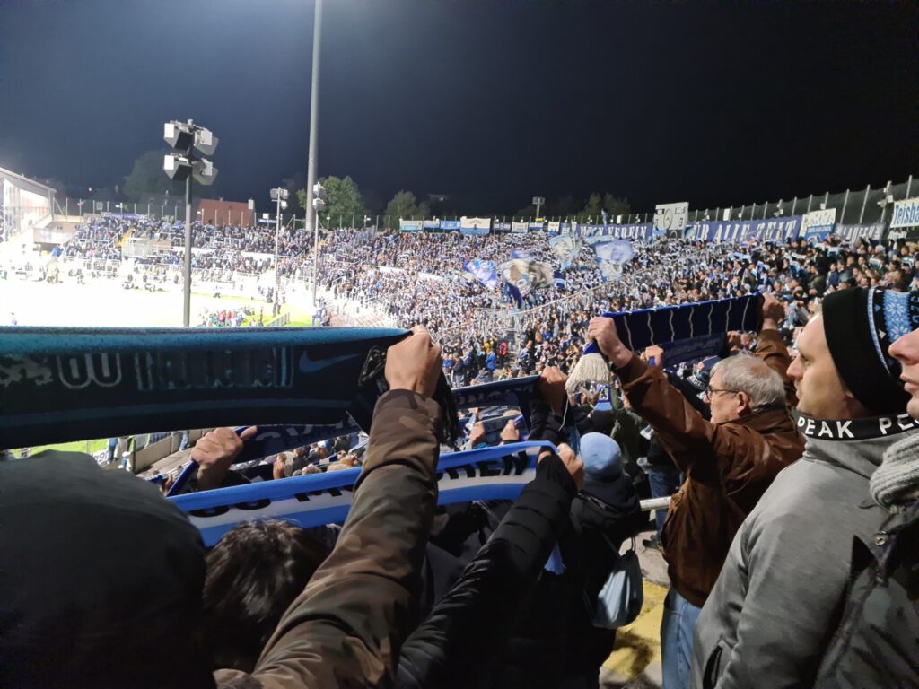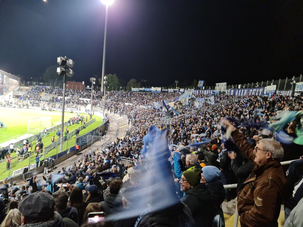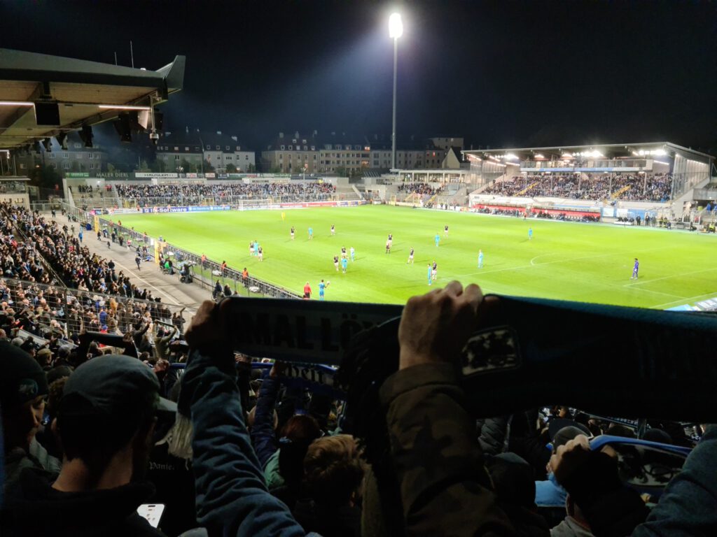 Was für ein Jubel! Hier geht doch heute noch mehr? Und wirklich: kurz danach zappelt der Ball wieder im Kölner Tor, versenkt durch Flo Niederlechner. Leider aber lange Gesichter im Stadionrund: kein Treffer, da vorher Offensivfoul bzw. Hand. Große Enttäuschung! Die Unterstützung von den Rängen lässt aber nicht nach, die kämpferisch aufgelegte Löwen-Mannschaft reißt heute das Stadion mit. Trotz dauerndem Anrennen und einigen Chancen will aber kein Treffer mehr fallen, und so bleibt es beim Unentschieden.