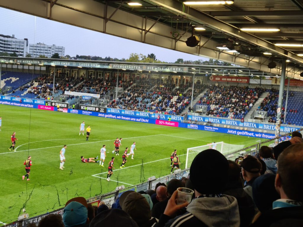 Wenig Schönes gab es in Wiesbaden zu sehen am langen Fußballwochenende. Immerhin konnte ich ein paar zusätzliche Spiele unterbringen, so gibt es etwas Ablenkung vom erneut sehr tristen Auftreten der Löwen. Auch heute wieder ein Spiel ohne Selbstvertrauen und Mut. Erkennbar war allerdings der Wille, diesmal nicht gleich wieder zu Beginn in Rückstand zu geraten. Zumindest dies konnte verhindert werden, nach vorne ging aber wie schon erwähnt eher nix, zweite Bälle landeten immer gleich bei den Gastgebern. Mehr fällt mir tatsächlich nicht ein. Bemerkenswert sonst war, dass auch hier ein paar Hauptstadtlöwen dabei waren, und dass es in der sich Arena nennenden Wellblechhütte auch Ebbelwoi gab. Unser nächster Trainer sollte schnell die Ärmel aufkrempeln, am heutigen Engagement des Interimstrainers hat es nicht gemangelt.